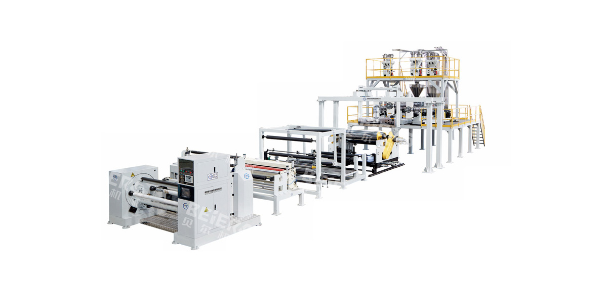 儲(chǔ)料 → 自動(dòng)輸送 → 混料 → 擠出系統(tǒng) → 流延系統(tǒng) → 輸送 → 廢邊收集 → 分切 → 收卷